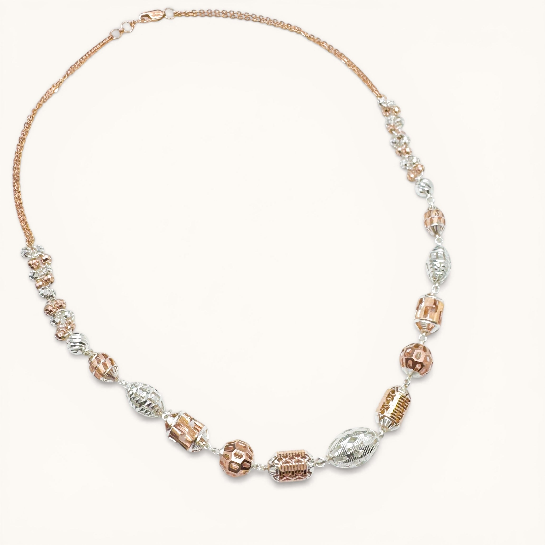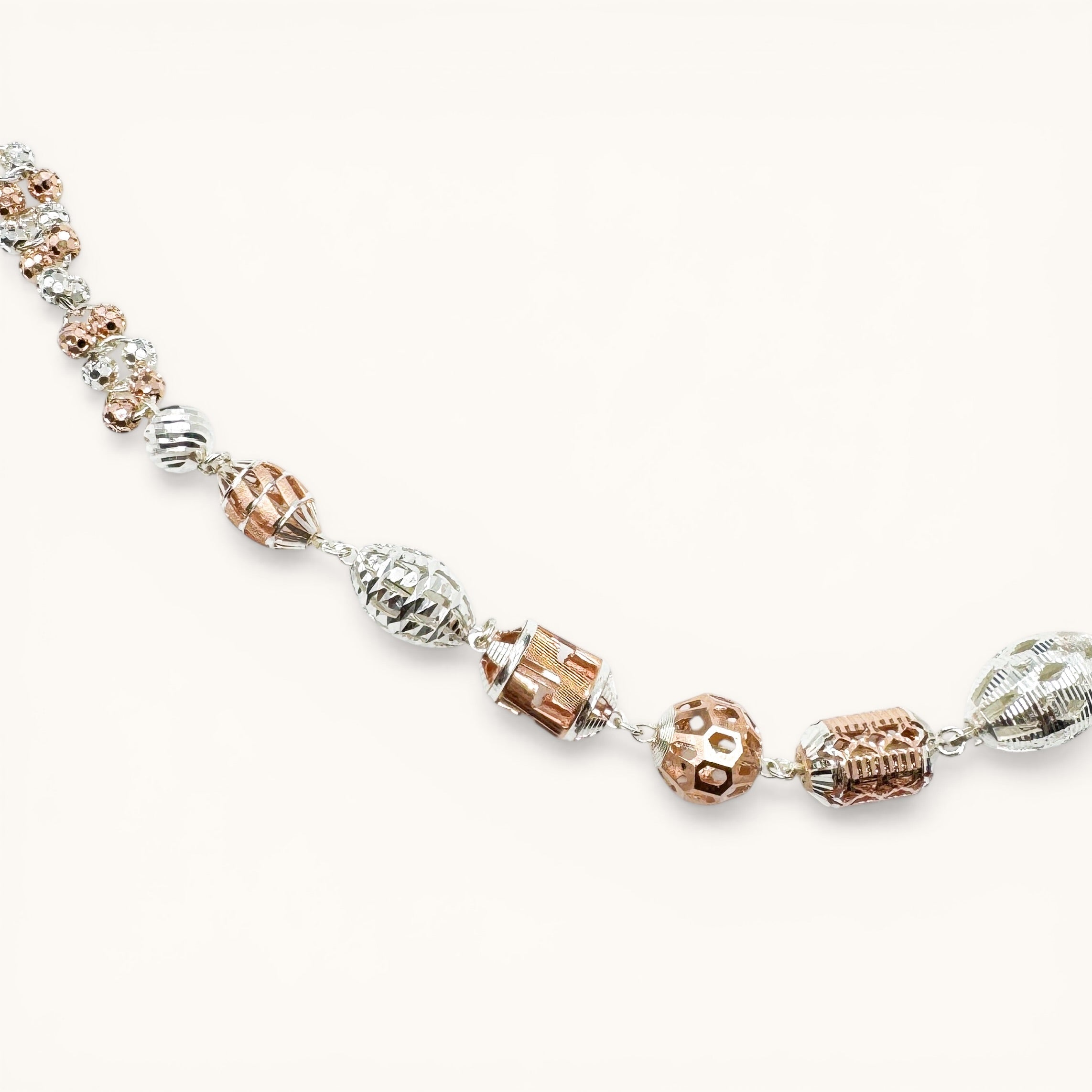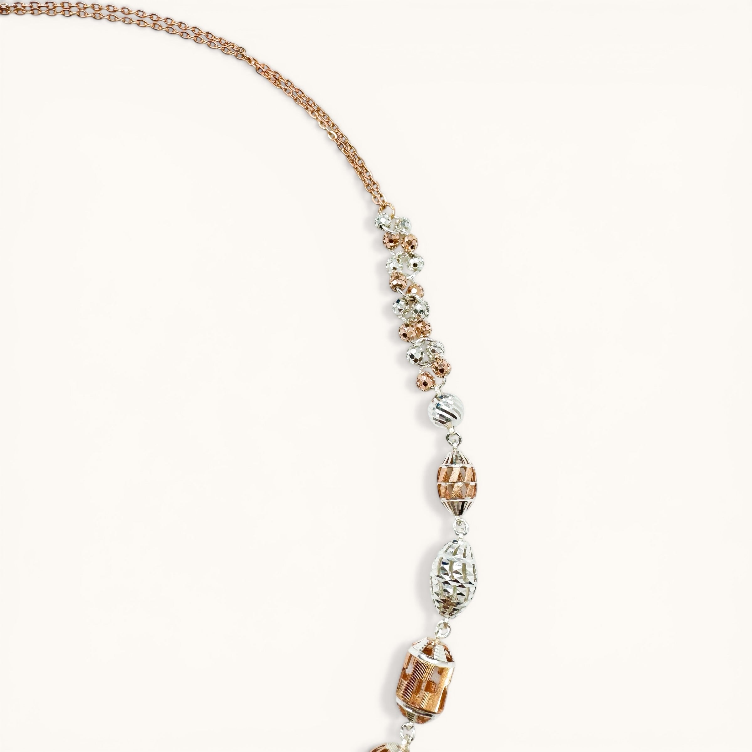 Every bead from the Rosée family, strung together in one piece. Rose-toned and silver beads in alternating shapes — spheres, ovals, barrels and lanterns — graduate gently toward the centre in a rhythm that feels effortless and intentional all at once. The most complete expression of the Rosée collection, worn around your neck.