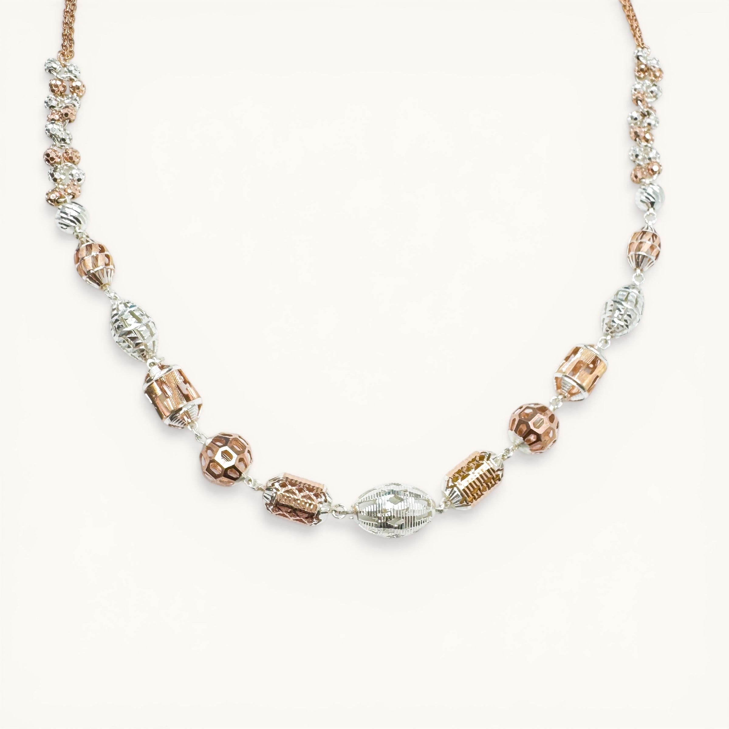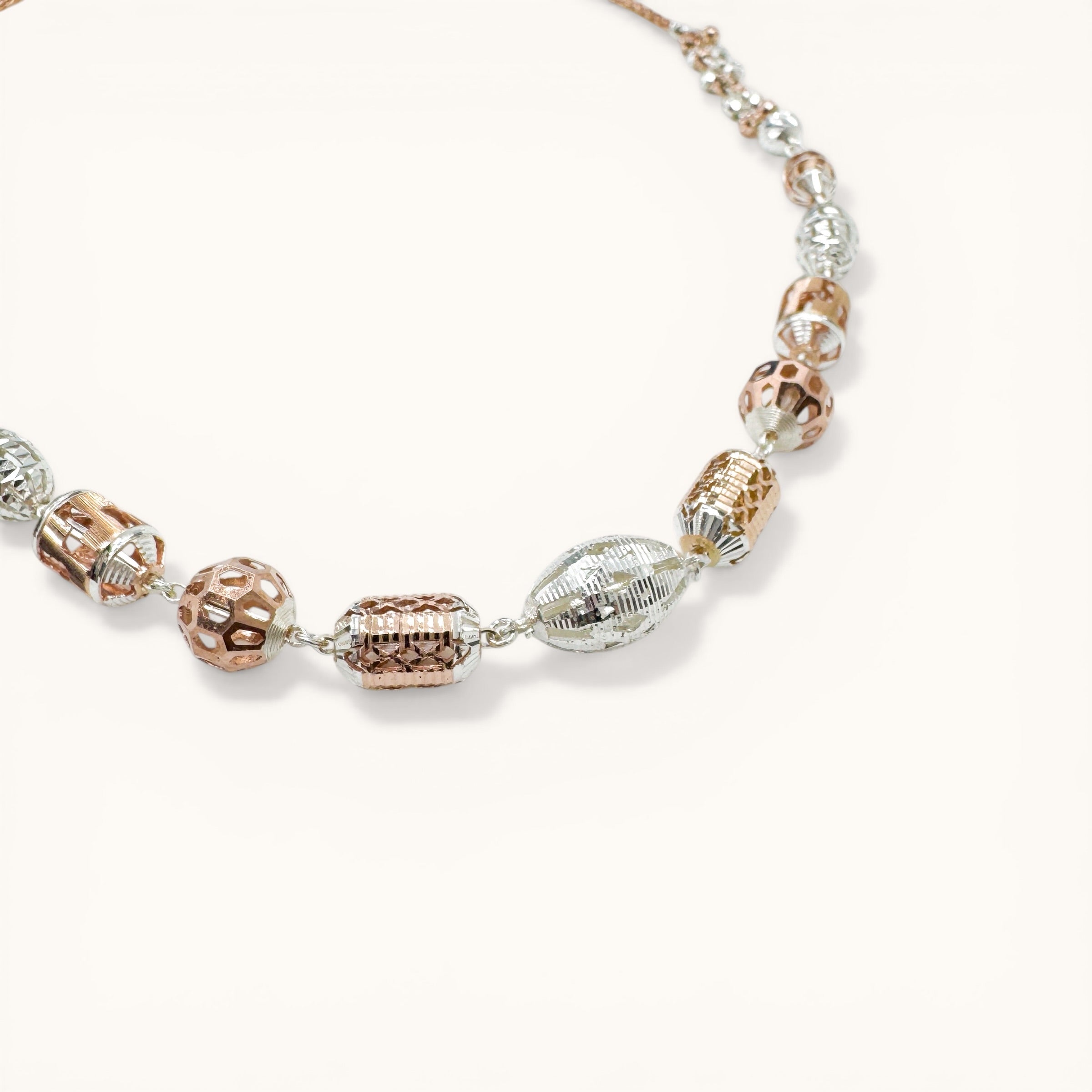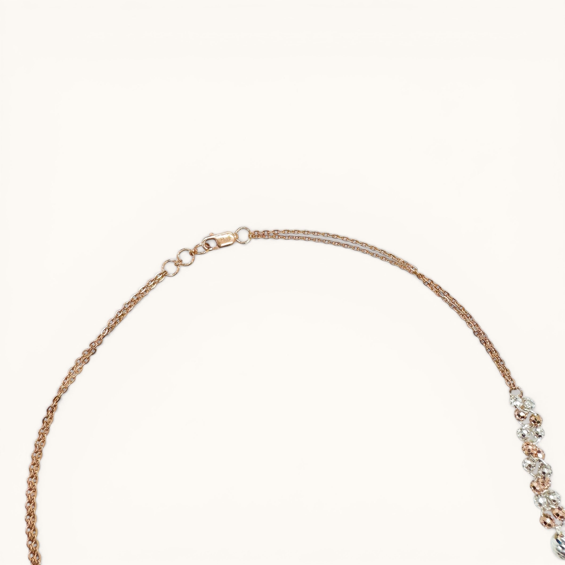 Every bead from the Rosée family, strung together in one piece. Rose-toned and silver beads in alternating shapes — spheres, ovals, barrels and lanterns — graduate gently toward the centre in a rhythm that feels effortless and intentional all at once. The most complete expression of the Rosée collection, worn around your neck.
