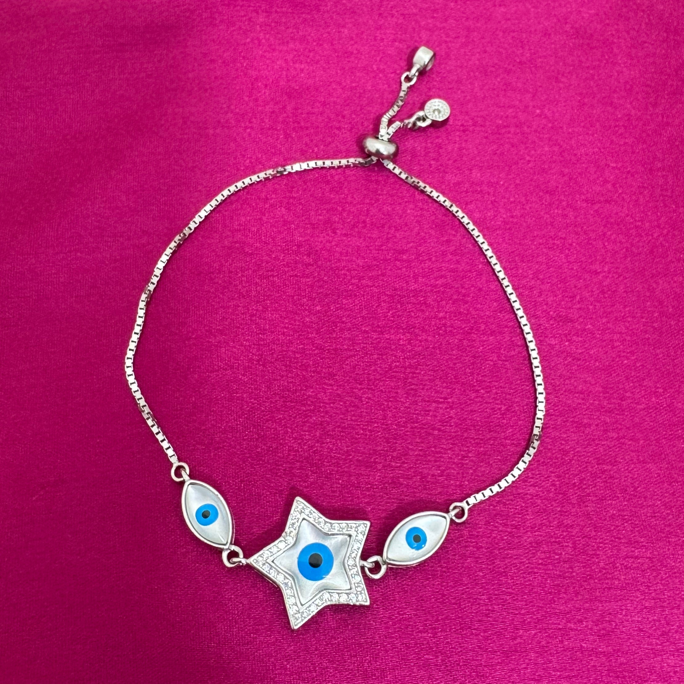Evil eye bracelet made of mother of pearl stone in adjustable chain so that you don't have to worry about sizing. Made in pure 925 silver.